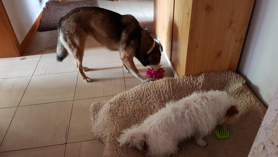 Wie wichtig und schön Nasenarbeit für Hunde ist, spreche ich auch in Kursen häufig an und wir haben auch einen reichen Fundus an Intelligenz-Spielen und Variationen von Päckchen, mit denen unsere Hunde Nasen- und Kopfarbeit auch in allgemeinen Kursstunden durchführen können. Zu erwähnen sei an dieser Stelle natürlich auch die Möglichkeit, an speziellen Kursen, wie z.B. Mantrailing (die Suche nach versteckten/vermissten Personen) teilzunehmen oder auch an speziellen Nasenarbeitskursen, in denen die Hunde z.B. lernen, den verlorenen Schlüssen zu suchen, verschiedene Gerüche zu unterscheiden und anzuzeigen usw. Weitere Facetten, unsere vierbeinigen Freunde auf einfache und schöne Weise zu Hause zu beschäftigen, ist – neben Kauartikeln, wie z.B. Trockenpansen, Büffelhautknochen usw. – der Einsatz von Kongs und Schleckmatten. Beides ist für innen im Haus und auch draußen auf der Terrasse oder im Garten geeignet. Beim Anklicken der einzelnen Fotos gibt es jeweils eine kurz Beschreibung dazu. Nochmal in Kurzform: Schnüffeln, Kauen und Schlecken gehören zu den Grundbedürfnissen unserer Hunde und daher ist es sinnvoll, ihnen täglich etwas davon anzubieten. Dies trägt zum Wohlbefinden und zur Ausgeglichenheit unserer vierbeinigen Freunde bei 🙂 .